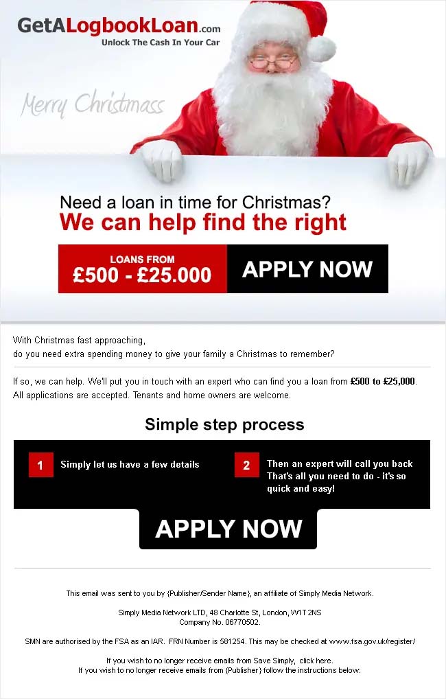 Get a Log Book Loan contacted DCP Email Designers to create a newsletter design for their Christmas lead generation marketing campaign. Get a Log Book Loan requested for the newsletter to incorporate a red, black colour scheme and Santa Claus!