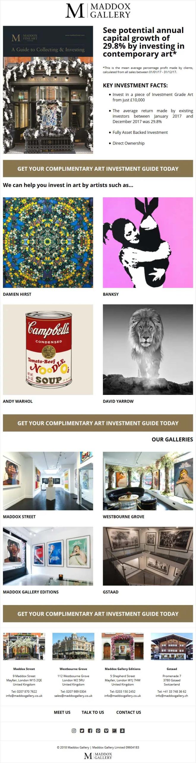 The newsletter was created using Adobe Photoshop CC. DCP incorporated text and images from the Maddox Gallery lead generation website.