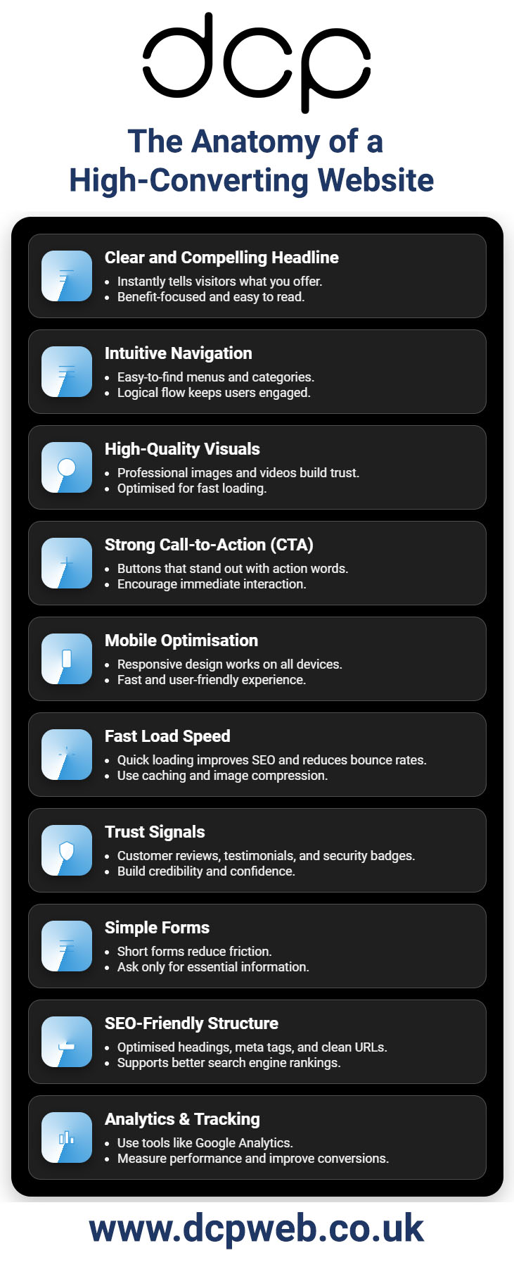 A high-converting website is the result of multiple well-executed elements working together. From clear headlines and visuals to speed, SEO, and analytics, every section plays a role in guiding visitors, building trust, and driving action.
