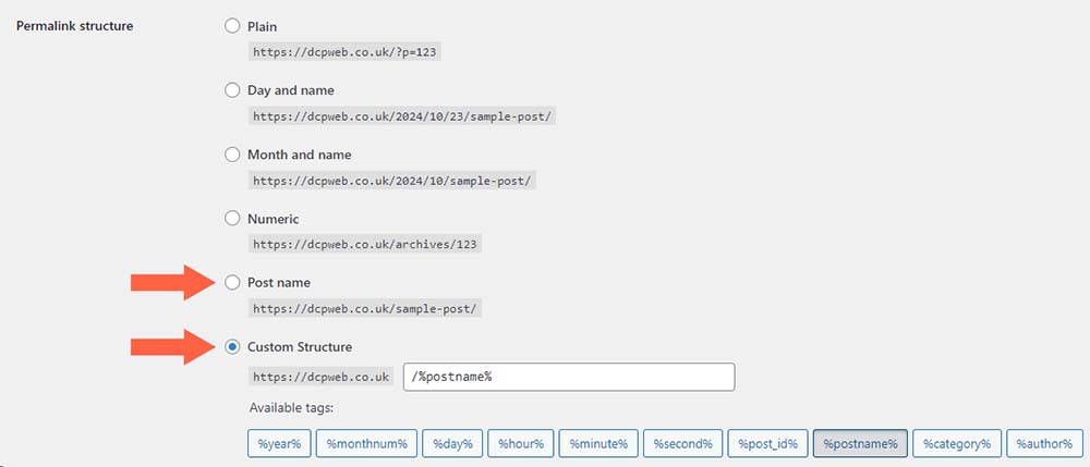 - Select the Post Name option for a cleaner URL structure (e.g., www.yourwebsite.com/sample-post).