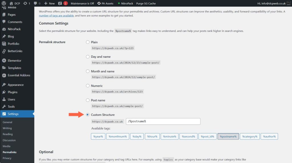 WordPress comes out of the box with messy, unreadable permalink URLs that look like “yoursite.com/?p=123”. These aren’t great for humans and make it hard for Google to work out what your site’s pages are about. Good SEO begins with clear, simple URLs such as “/about-us” or “/blog/healthy-cooking-tips”.